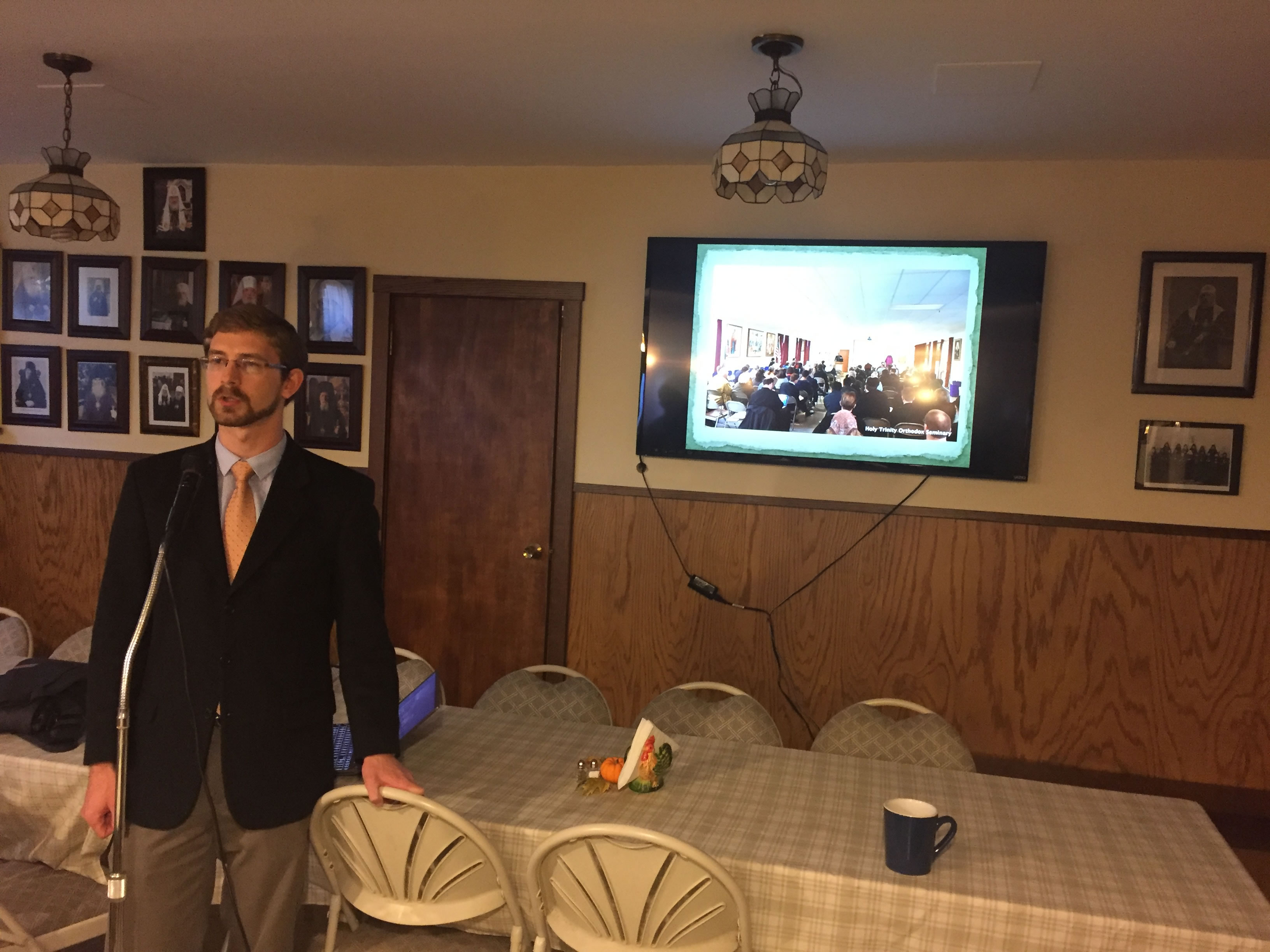 В воскресенье, 29 ноября, после Божественной литургии, совершенной настоятелем храма при протодиаконах Павле Волкове и Евгении Каллауре, за обедом в трапезной Михаилом Петровичем Перекрестовым была сделана интересная презентация о сегодняшнем дне Свято-Троицкой Духовной Семинарии в Джорданвилле (Нью-Йорк). Рассказав всем присутствовавшим о деятельности семинарии и показав всем видеоролик, Михаил Петрович ответил на вопросы участников беседы. В конце беседы отец Серафим выразил благодарность Михаилу Петровичу, вручив ему пожертвование на семинарию от прихожан и богомольцев Серафимовского прихода.