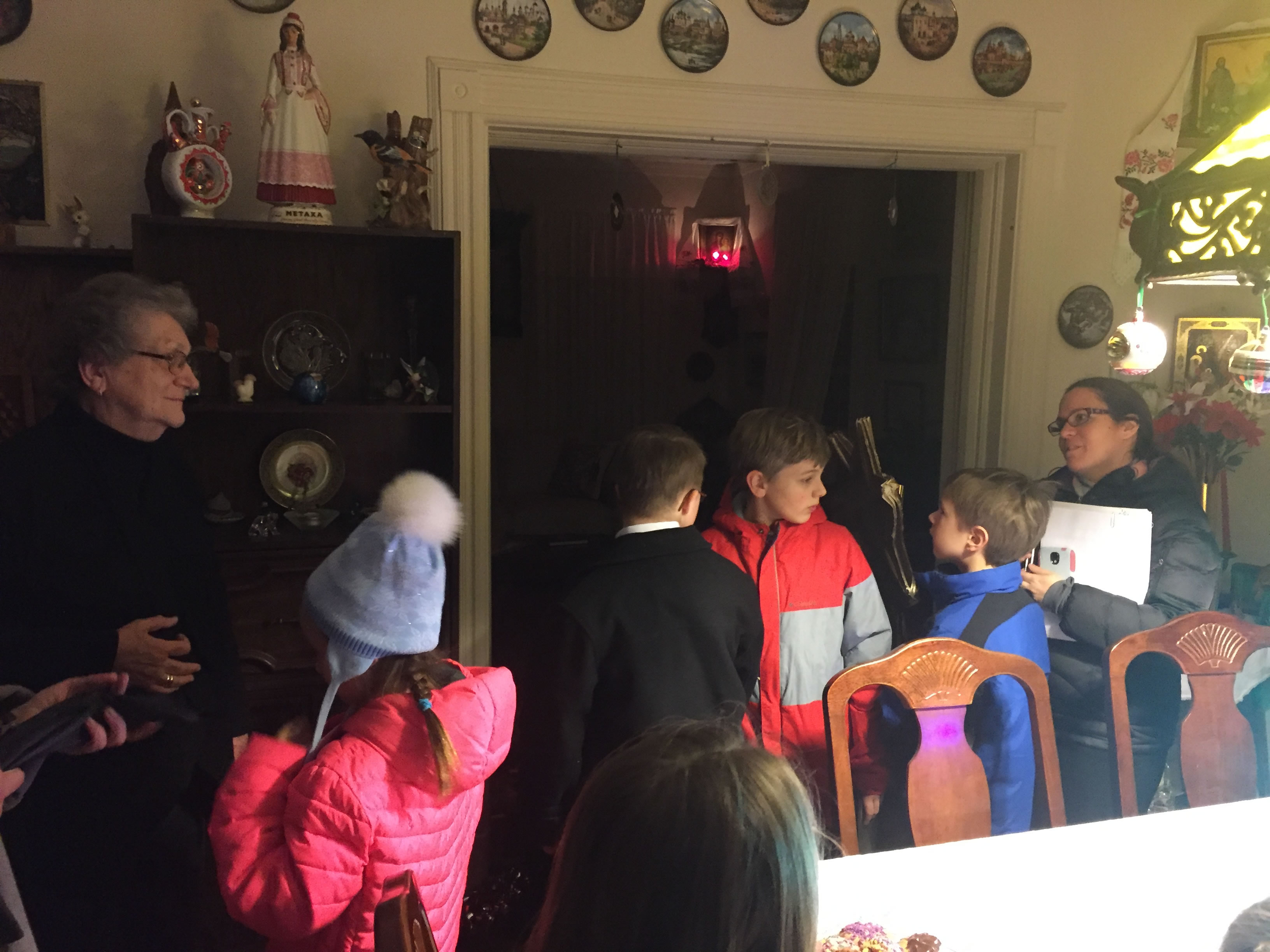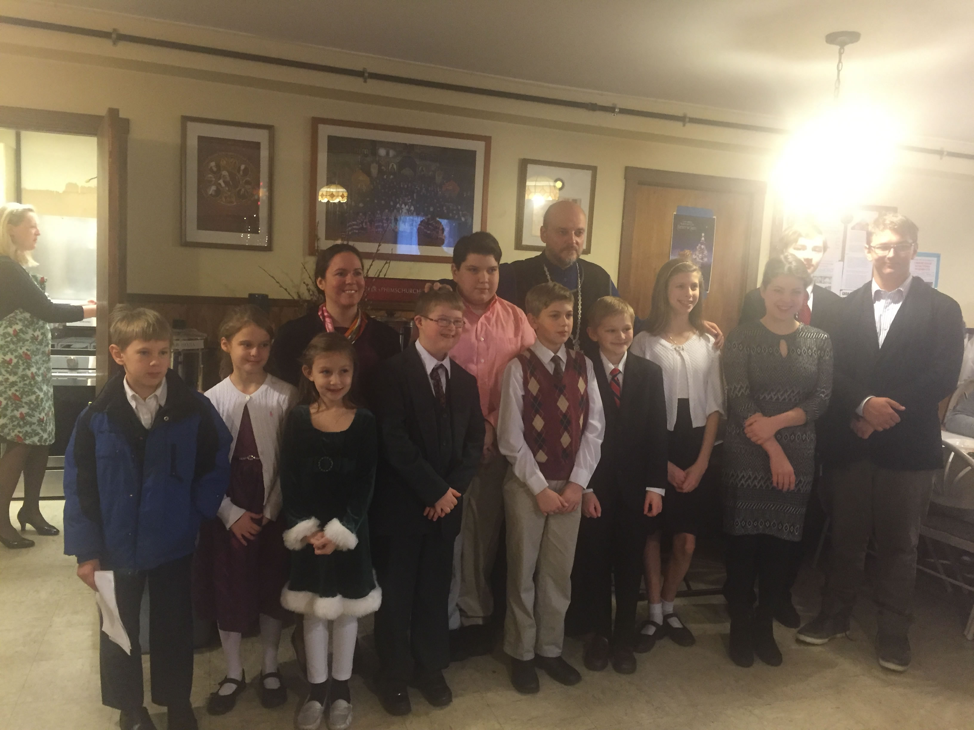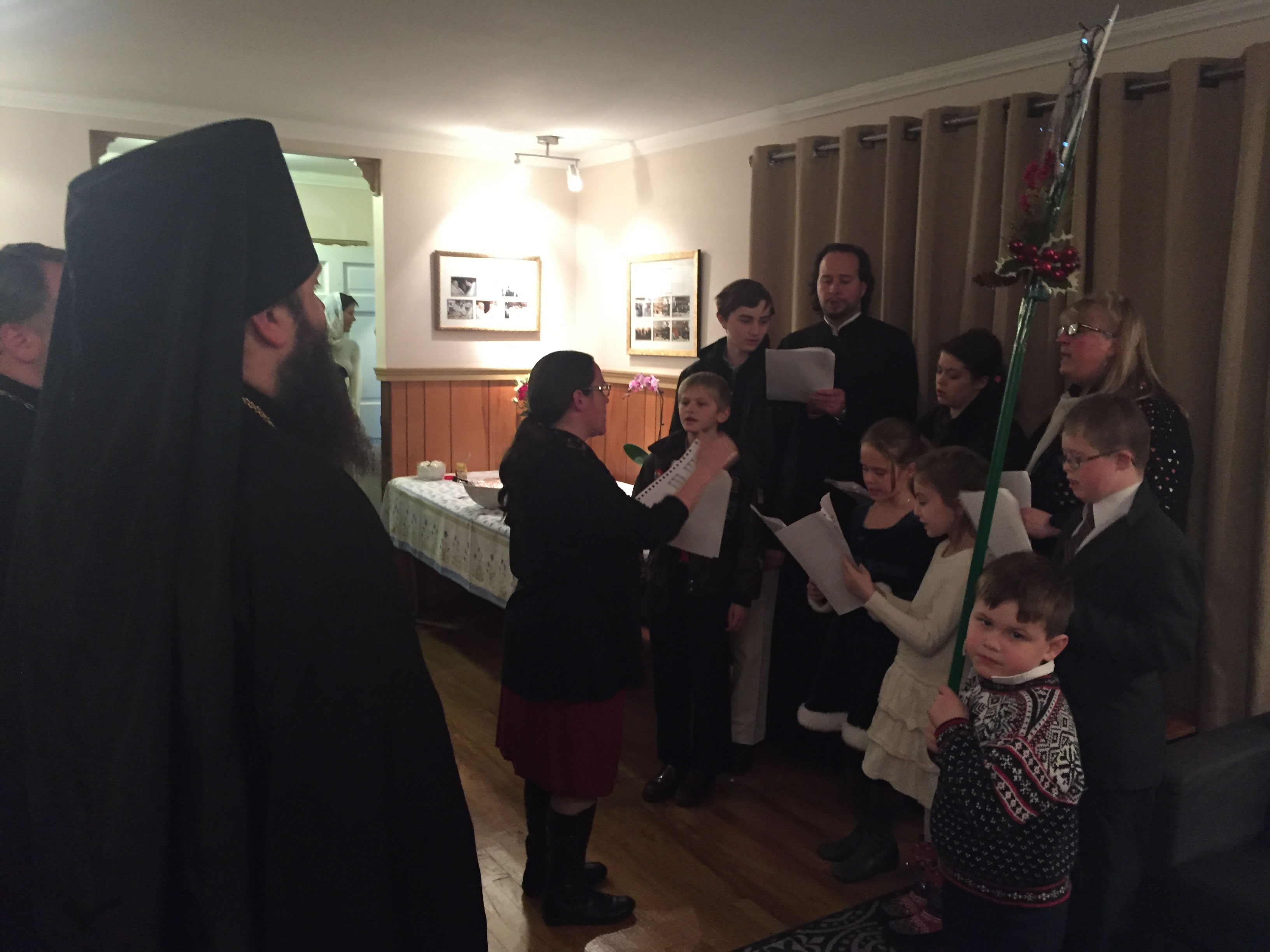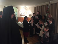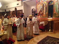 В четверг вечером, 14 января, накануне дня преставления и 25-летия второго обретения мощей преподобного Серафима Саровского, епископ Манхеттенский Николай, Заместитель Секретаря Архиерейского Синода, совершил в нашем храме полиелейную Утреню в присутствии Курско-Коренной иконы Божией Матери, перед которой небесный покровитель нашего прихода, будучи отроком, получил исцеление. По окончании торжественного богослужения Его Преосвященство обратился к многочисленным богомольцам со словами приветствия и назидания, после чего настоятель храма, выразив благодарность Преосвященному владыке Николаю за принесение в Серафимовскую церковь главной святыни Русской Зарубежной Церкви, пригласил архипастыря, духовенство и всех собравшихся в свои покои на праздничный прием. Здесь детский хор под управлением Е.И. Каллаур пропел тропарь Рождества Христова и несколько колядок, а Его Преосвященство, призвав Божие благословение на детей, каждому из них вручил по шоколадке. После молитвы и благословения трапезы продолжилось общение духовенства и мирян с Преосвященным Николаем.