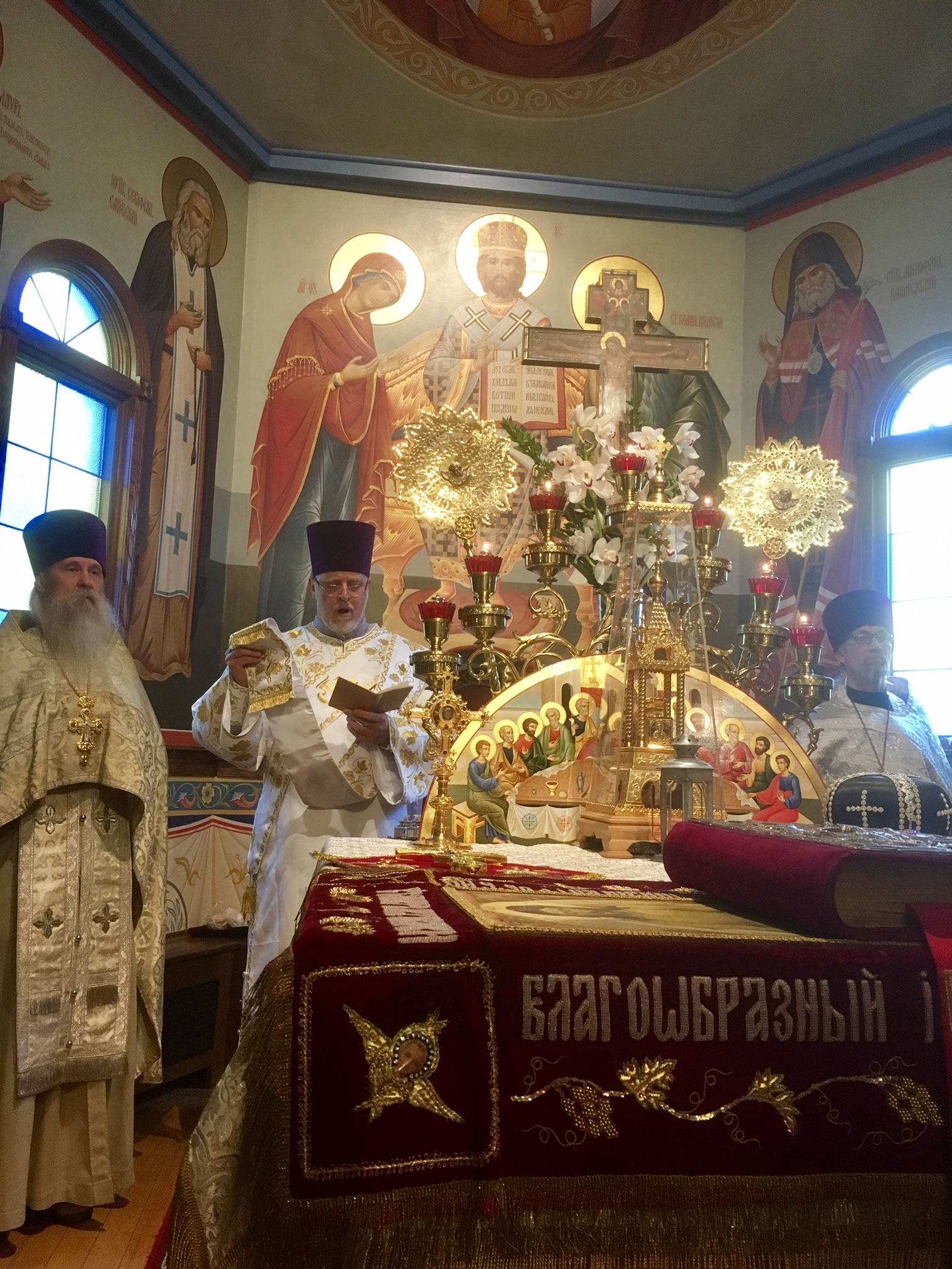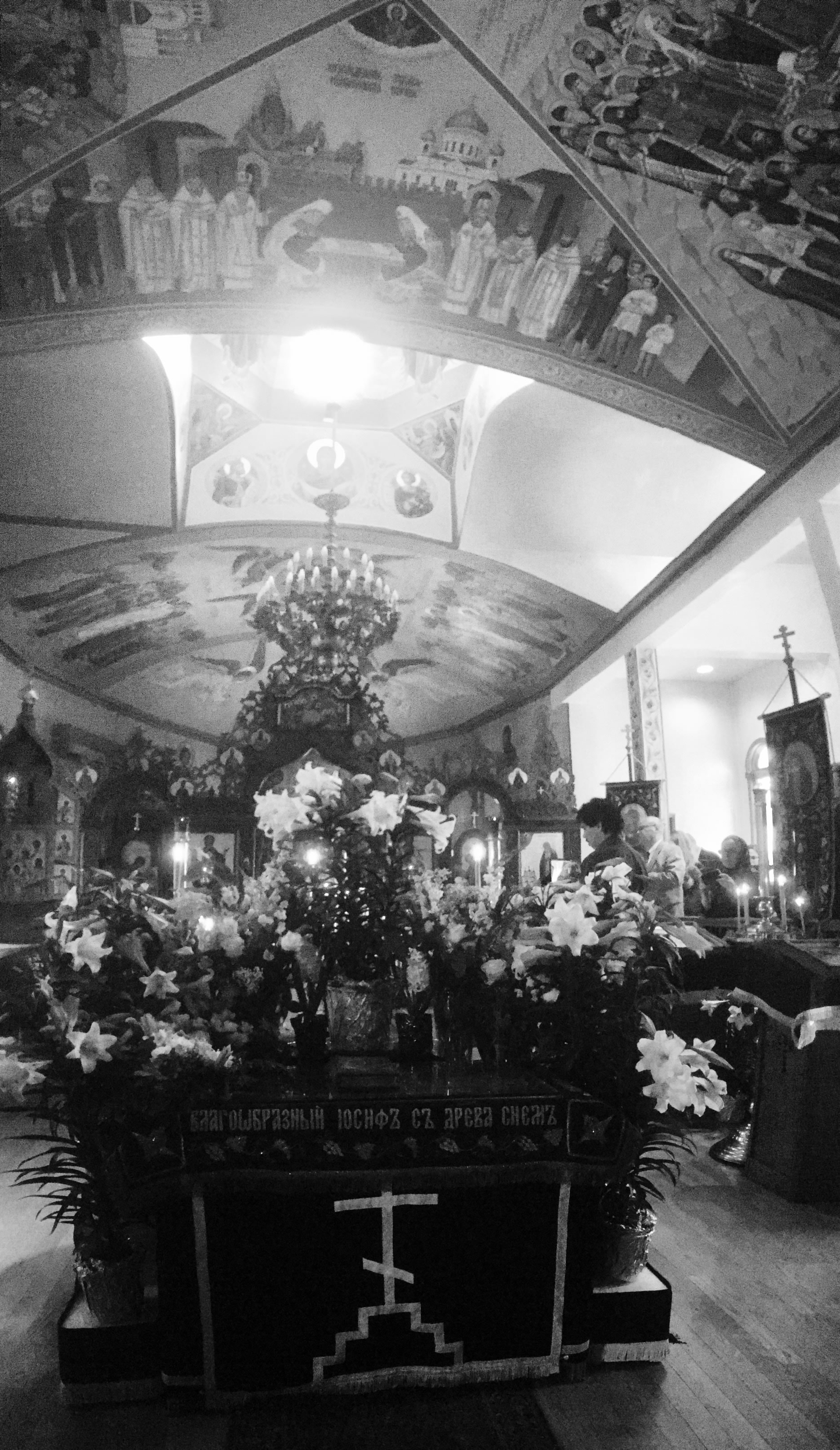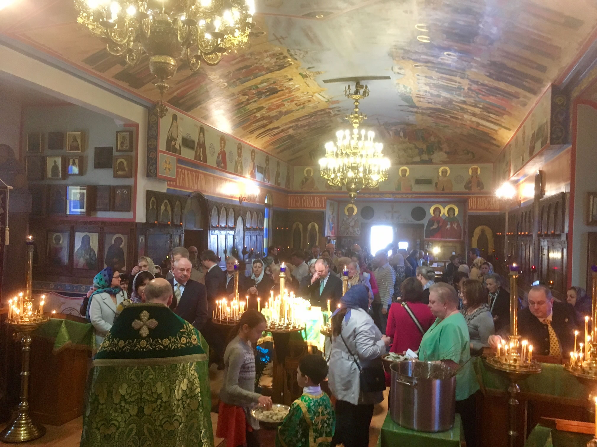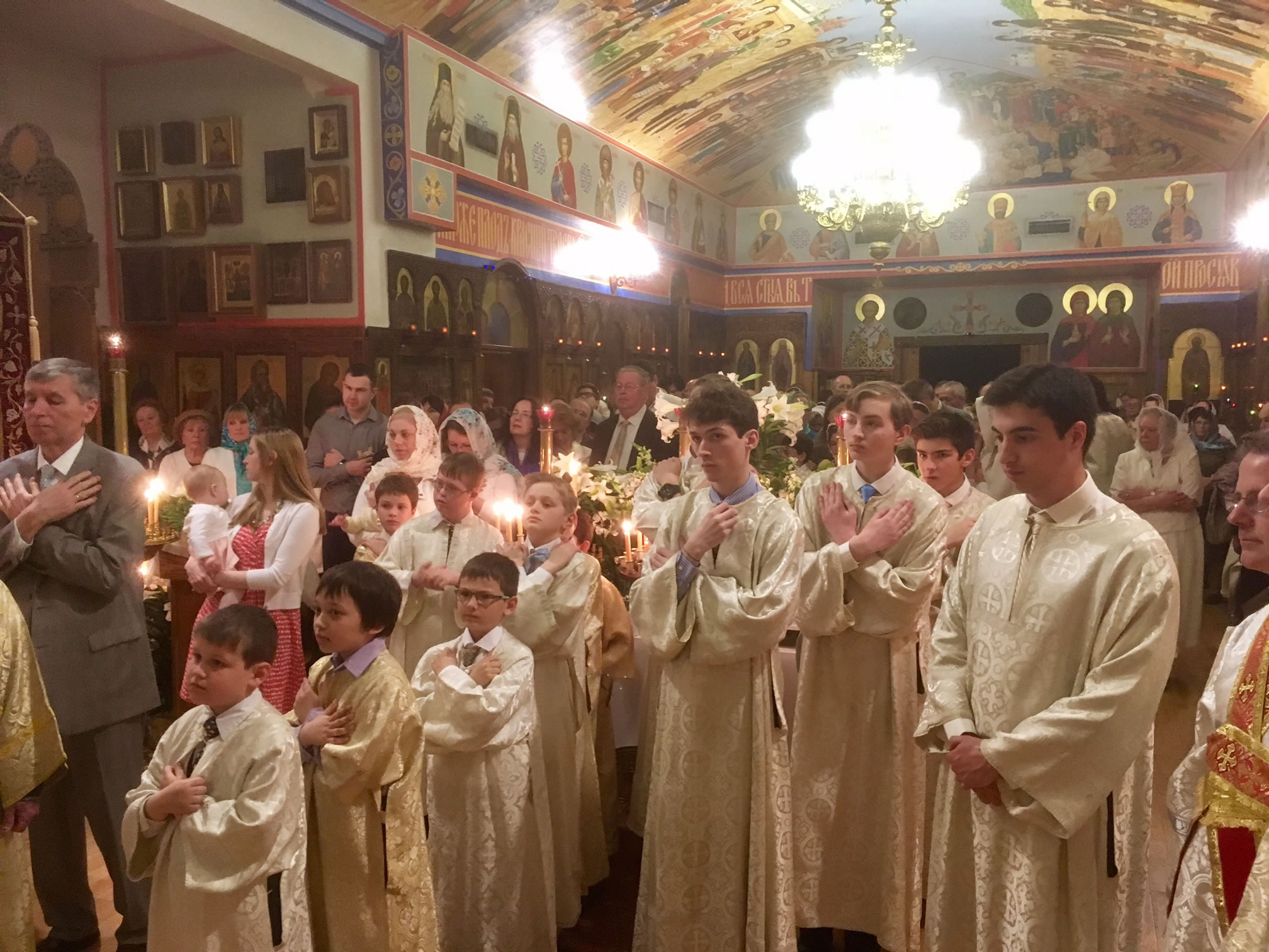 Богослужения Страстной Недели и Пасхи Христовой в Серафимовской церкви, храме-памятнике восстановлению единства внутри Русской Православной Церкви, прошли многолюдно, торжественно, дружно, по-семейному и с большим духовным подъемом. К празднованию Пасхи Сестричество благоукрасило храм и церковный зал, а также устроило праздничную трапезу в ночь светлого торжества. Протодиакон Павел Волков, протодиакон Евгений Каллаур и прислужники во главе с П.П. Волковым тоже много потрудились в устройстве радостного для всех празднования. Умилительно и радостно пел хор под управлением Н.М. Миро, вселяя Пасхальную радость в сердца молящихся. А.С. и М.О. Слободские украсили лампадами путь ночного крестного хода. Стараниями протодиакона Павла Волкова и Г.Ф. Селинского на сайте нашего прихода велась прямая трансляция всех богослужений. К началу ночной службы народу собралось так много, что даже не всем хватило места внутри. Как всегда, самым трогательным и волнующим моментом в Пасхальном богослужении был крестный ход: в эту полночь, согласно христианской традиции, все православные храмы становятся олицетворением Живоносного Гроба Господня, в котором произошло чудо Светлого и Тридневного Восстания Христова. В эту святую ночь к Чаше Христовой приступили все собравшиеся богомольцы. Богослужения совершал настоятель храма в сослужении протоиереев Георгия Каллаура и Василия Расковского. В самый день Пасхи Христовой в храм-памятник был доставлен благодатный огонь, сошедший на Живоносный Гроб Господень в Иерусалиме в Великую Субботу. После Великой Пасхальной вечерни был дан большой прием в настоятельских покоях, во время которого Е.И. Каллаур устроила для собравшихся детей Пасхальные игры. Благодаря щедрой жертвенности В.Я. Беликова, собравшаяся молодежь сделала много снимков на своих телефонах, используя особый "Snapchat geofilter", посвященный празднованию Пасхи Христовой в СиКлифе. К соборным служениям Пасхальной Утрени и Божественной литургии, которые совершались в Светлый Понедельник и в Светлую Субботу, присоединились клирик Новодивеевского женского монастыря протоиерей Ярослав Беликов и иерей Николай Костур, секретарь епископа Новограчаницкого и Среднезападноамериканского Лонгина (Сербская Православная Церковь).